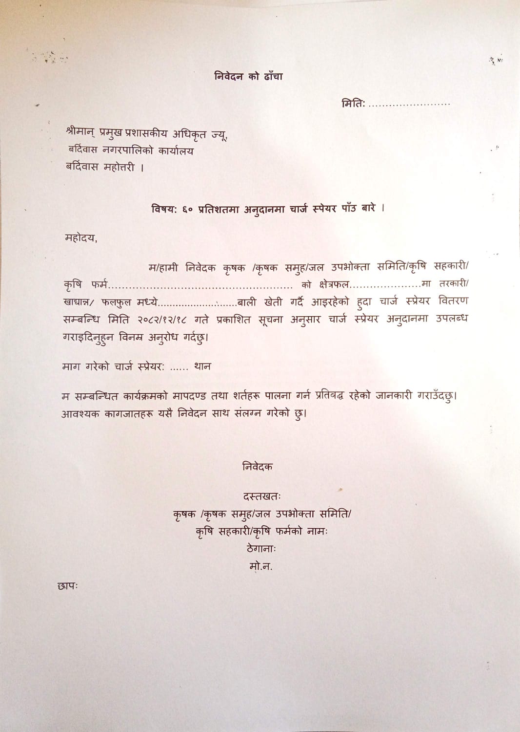 कृषकलाइ आवश्यक पर्ने चार्ज स्पेयर प्रस्तावका लागि सूचना।