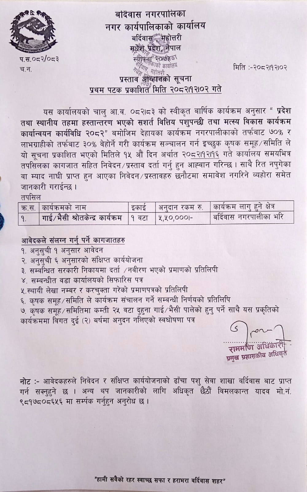 » गाइ/भैसी श्रोतकेन्द्र कार्यक्रम अनुदानका लागि प्रस्ताव पेश गर्ने सम्बन्धि सूचना।