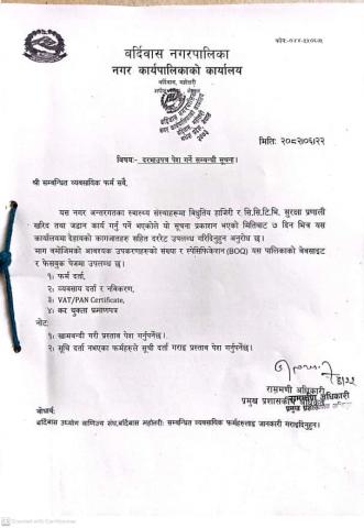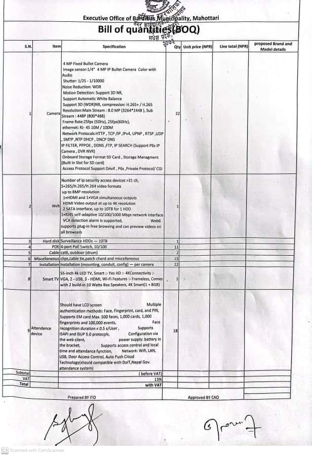 सिसिटिभि प्रणाली र फाइबर नेटवर्क स्थापना सम्बन्धि विधुतिय वोलपत्र आव्हान गरिएको सूचना। २०८२।०६।०८