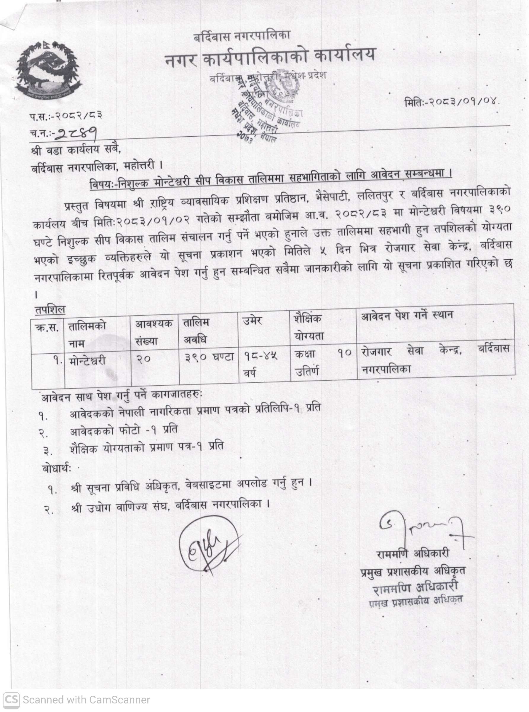 निशुल्क मोबाइल मर्मत र मोन्टेश्वरी सिप विकास तालिममा सहभागि हुन आवेदन पेश गर्ने सम्बन्धि सूचना।