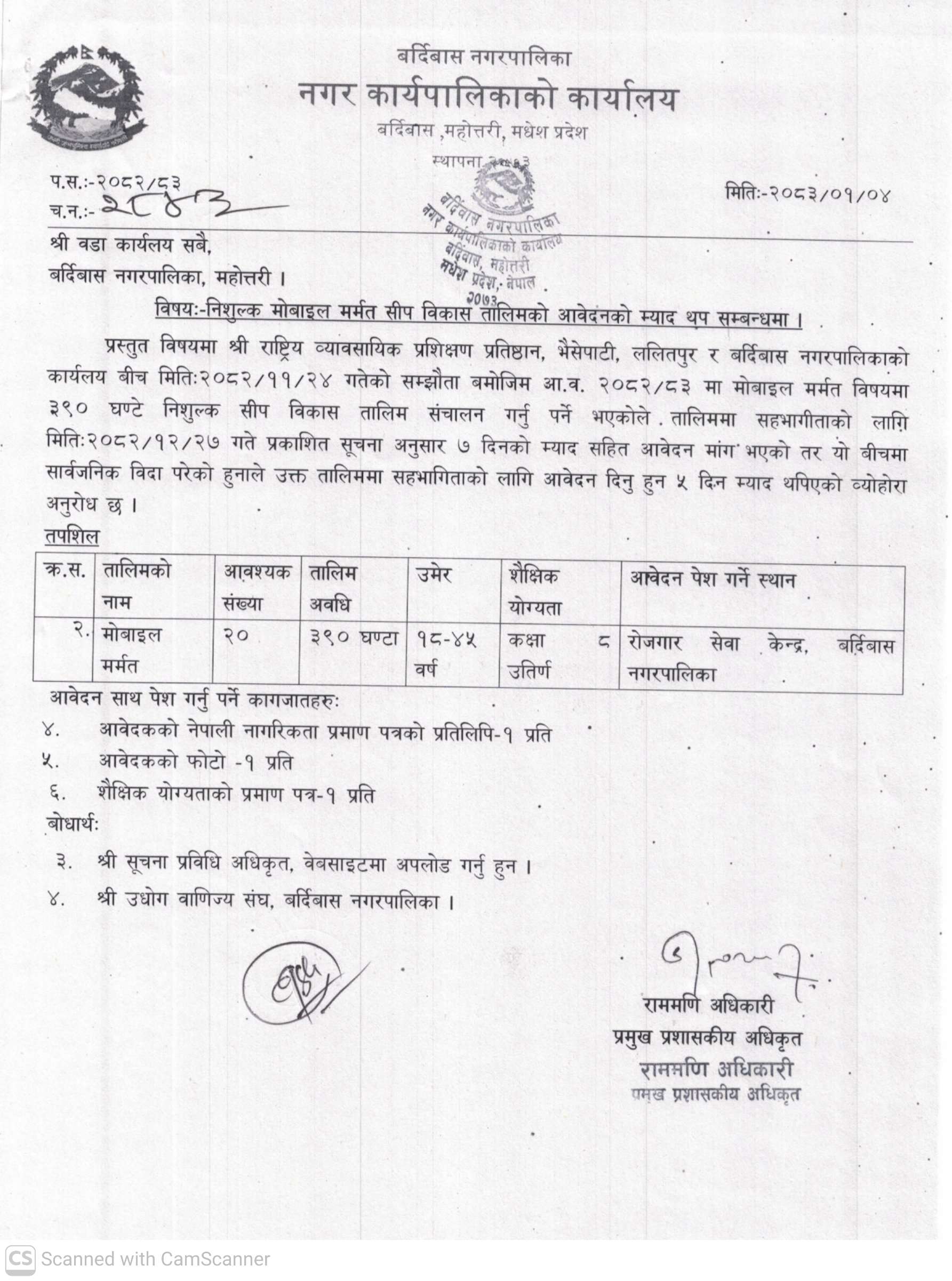 » निशुल्क मोबाइल मर्मत र मोन्टेश्वरी सिप विकास तालिममा सहभागि हुन आवेदन पेश गर्ने सम्बन्धि सूचना।