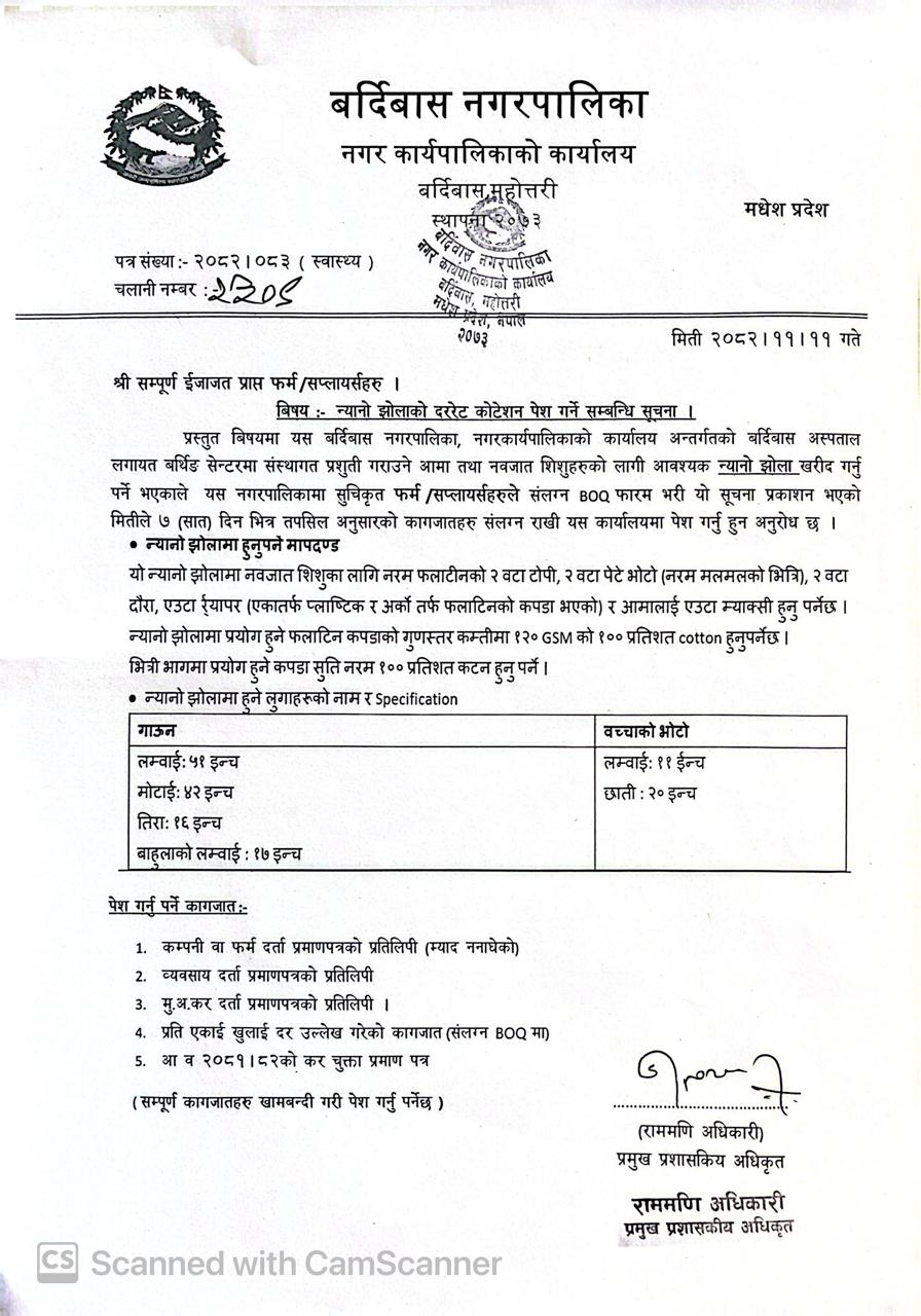 न्यानो झोलाको दररेट कोटेशन पेश गर्ने सम्बन्धि सूचना।