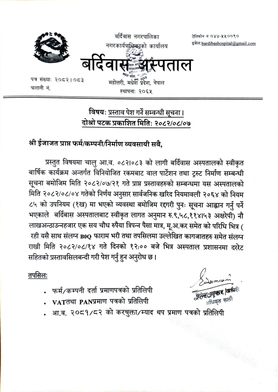 प्रस्ताव आह्वान सम्बन्धी दोस्रो पटक प्रकाशित सूचना (बर्दिबास अस्पताल वाल पार्टिशन)