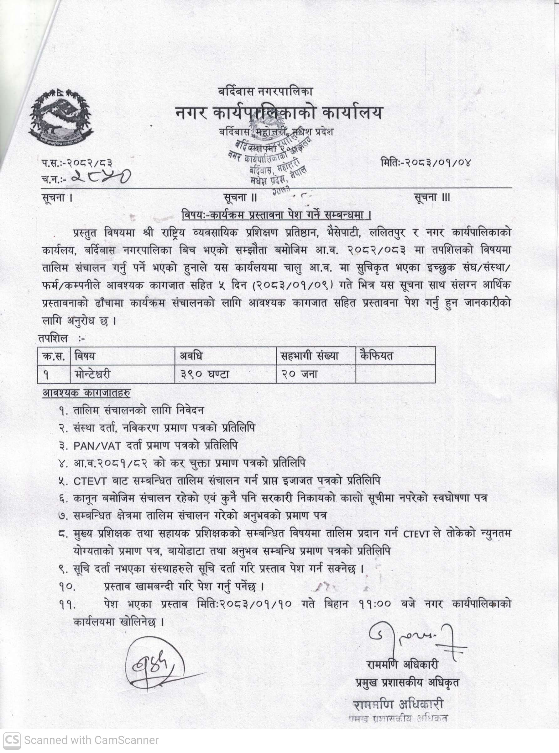 मोन्टेश्वरी सिप विकास तालिम कार्यक्रम सञ्चालन गर्नका लागि प्रस्ताव पेश गर्ने सम्बन्धि सूचना।
