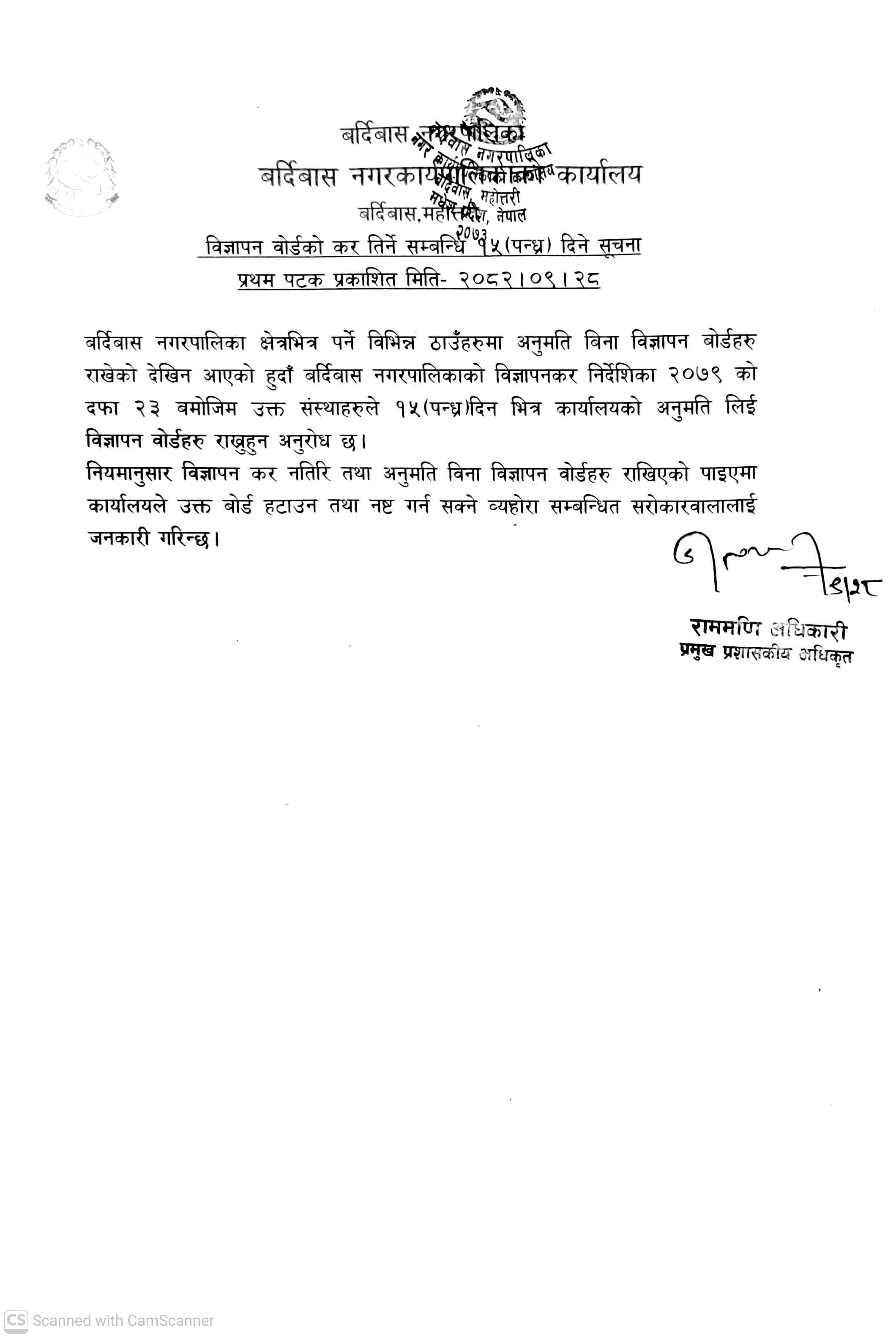 विज्ञापन बोर्डको कर तिर्ने सम्बन्धि १५ दिने सूचना। सूचना प्रकाशित मिति २०८२।०९।२८