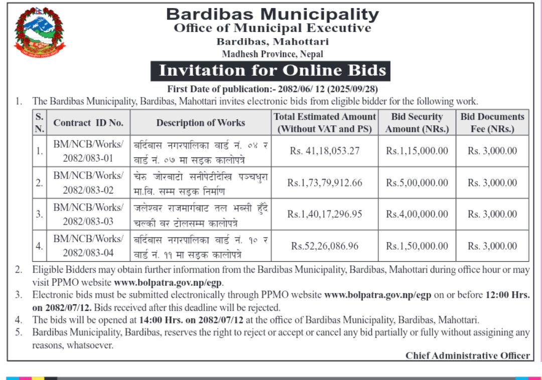 सिसिटिभि प्रणाली र फाइबर नेटवर्क स्थापना सम्बन्धि विधुतिय वोलपत्र आव्हान गरिएको सूचना। २०८२।०६।०८