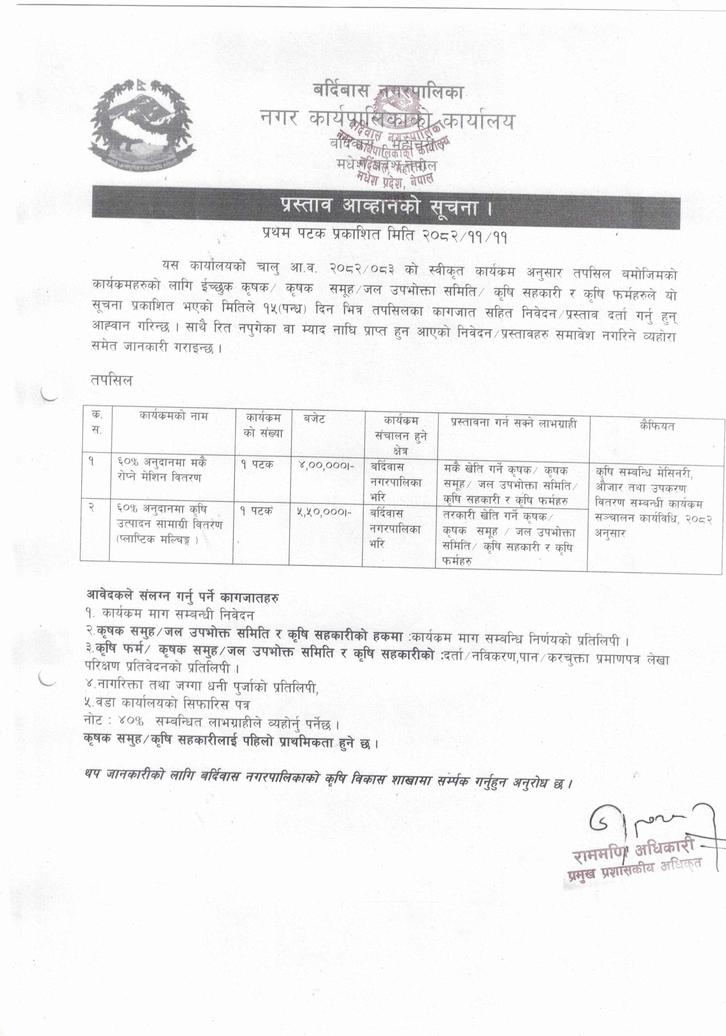 » अनुदानमा मकै रोप्ने मेसिन र कृषि उत्पादन सामाग्रि वितरणका लागि प्रस्ताव आव्हानको सूचना।