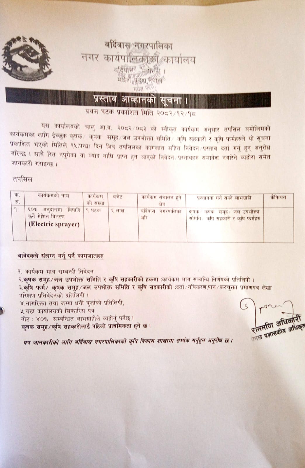 कृषकलाइ आवश्यक पर्ने चार्ज स्पेयर प्रस्तावका लागि सूचना।
