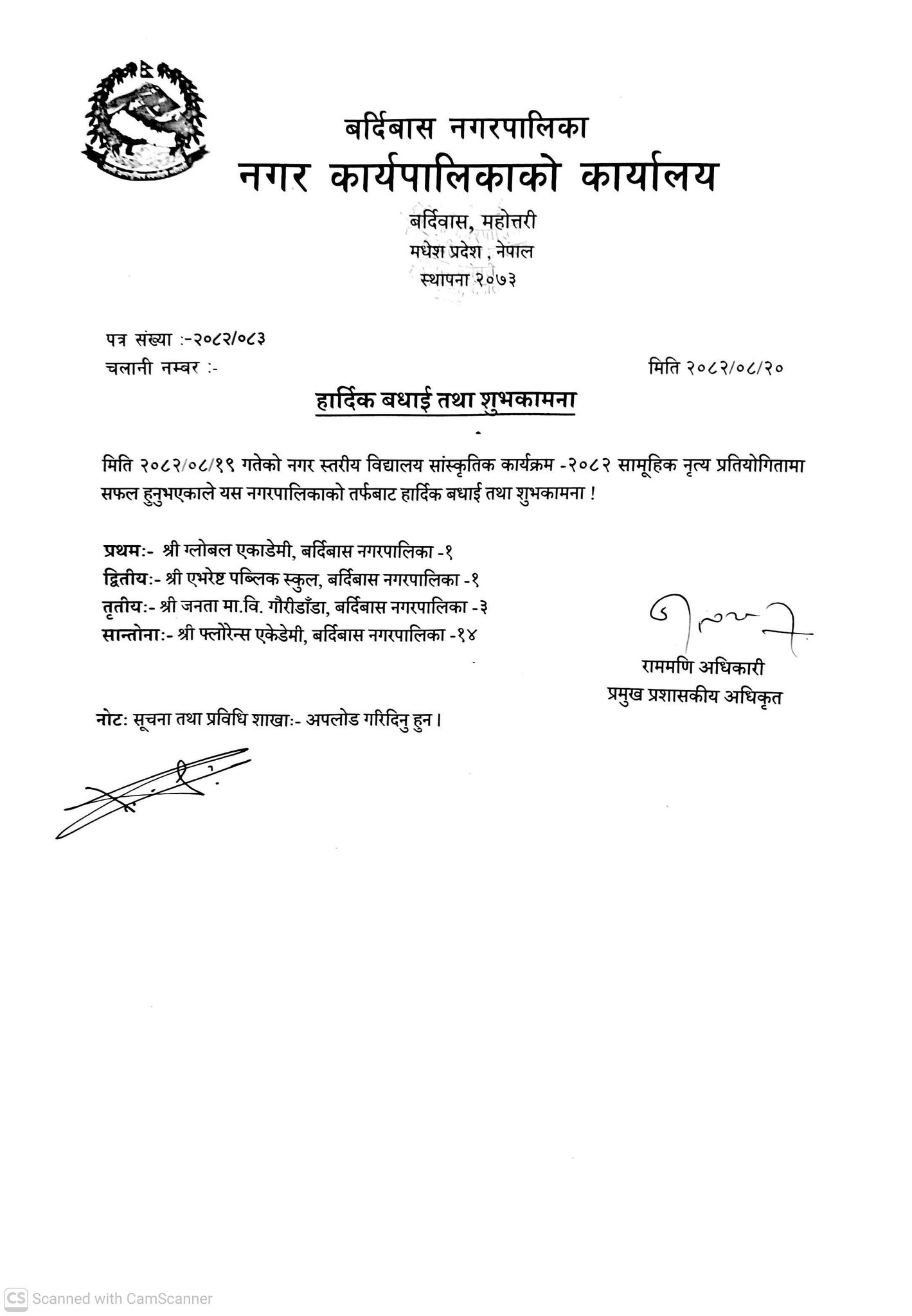 नगर स्तरीय नृत्य प्रतियोगितामा सहभागि विद्यार्थीहरुलाइ हार्दिक बधाई तथा शुभकामना।