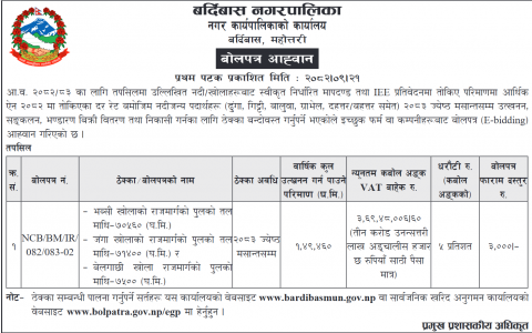 नदिजन्य पदार्थ उत्खनन्,संकलन,भण्डारण विक्रि वितरण तथा निकासी कार्यको लागि वोलपत्र आह्वान सम्बन्धि सूचना।