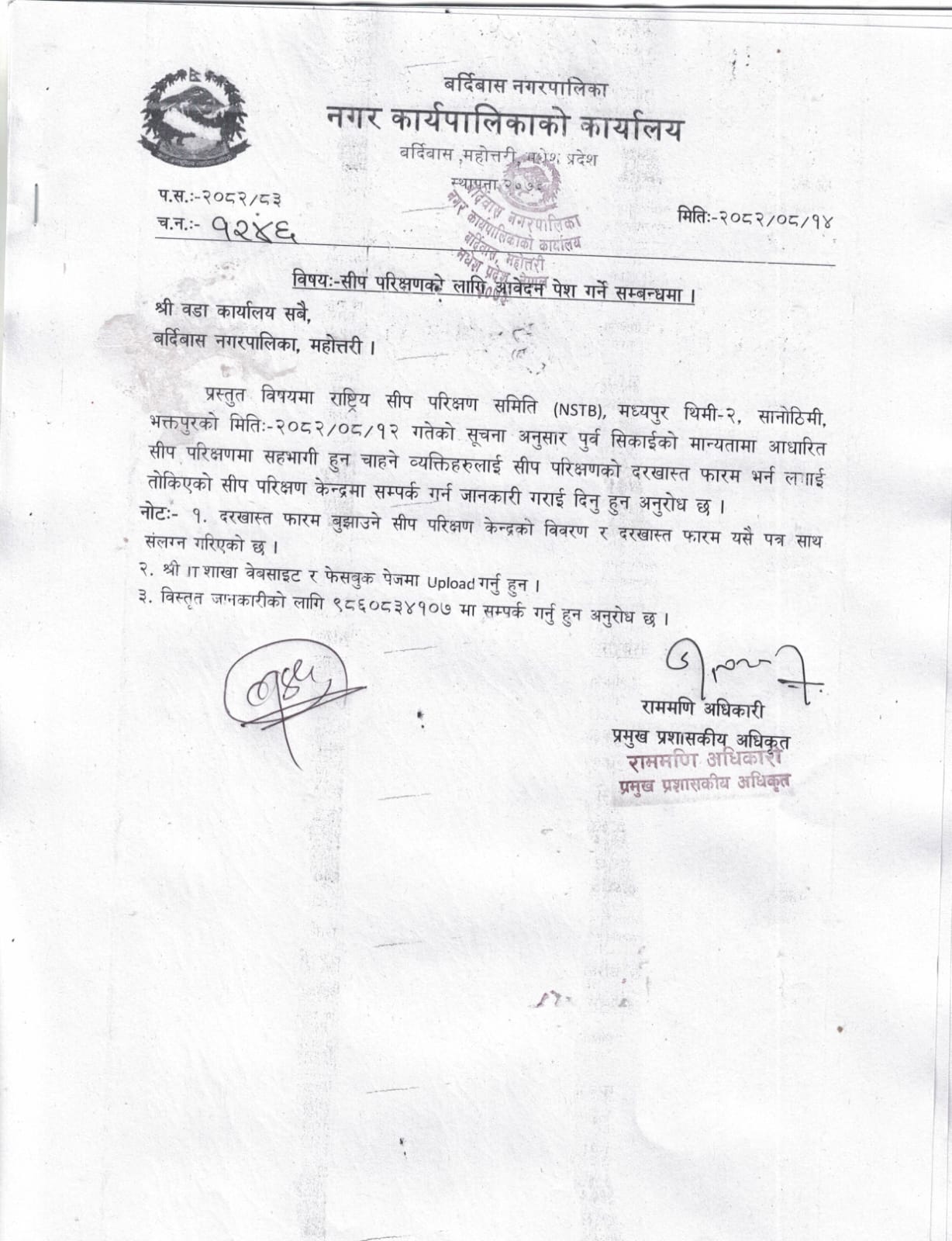 सिप परिक्षणका लागि आवेदन पेश गर्ने सम्बन्धि सूचना।