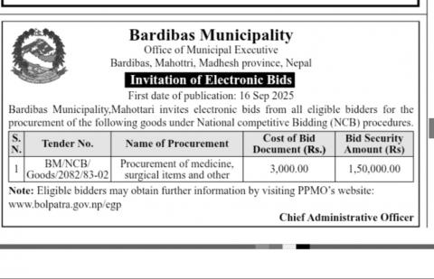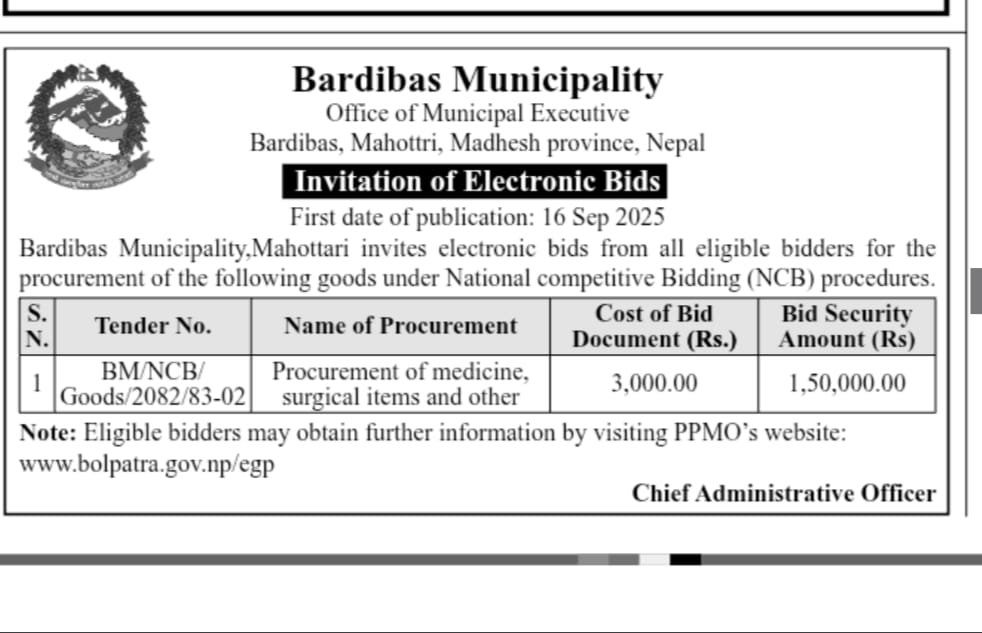 Medicine, Surgical items and others खरिदका लागि विधुतिय टेन्डर सम्बन्धि सूचना। (२०८२।०५।३१)