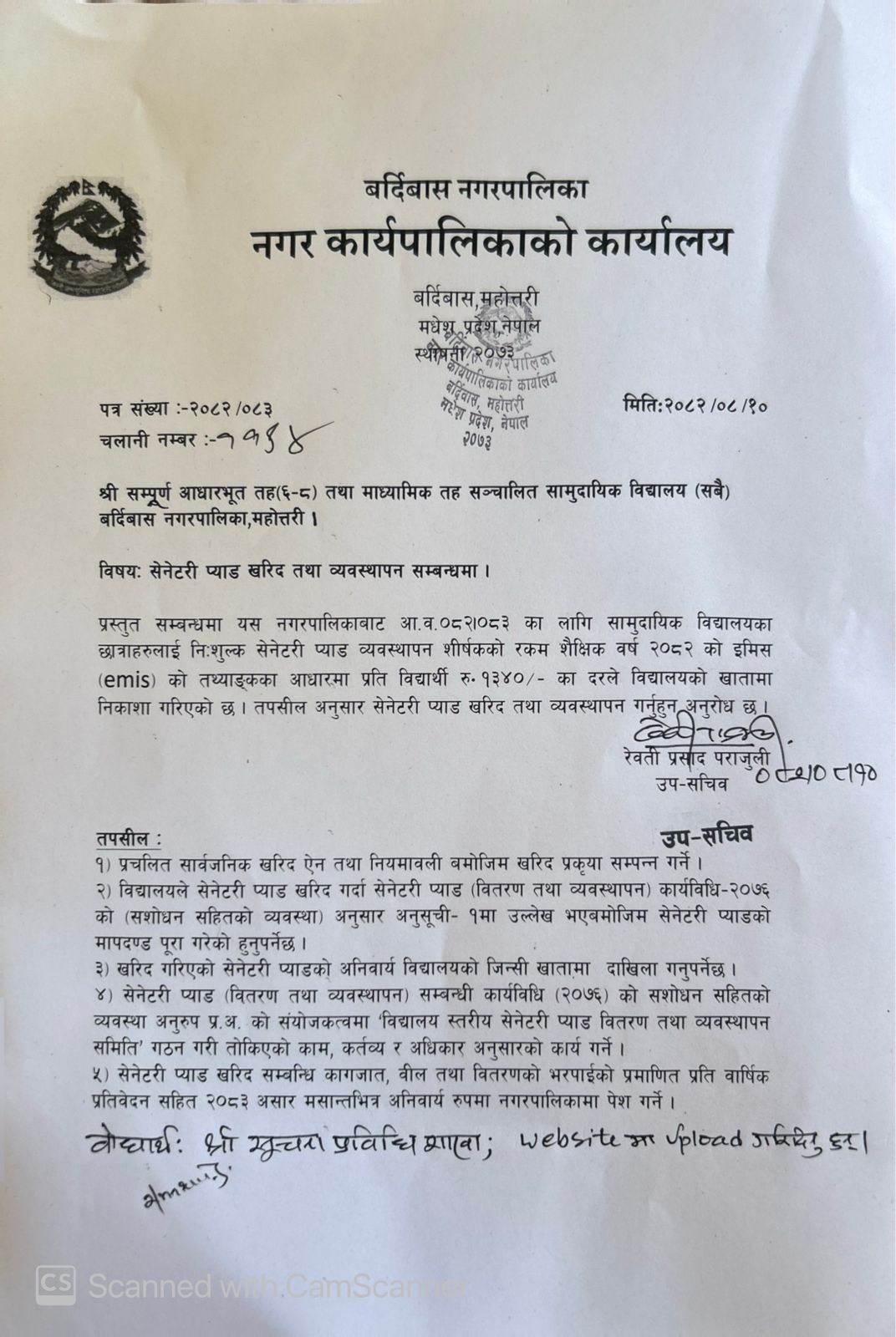 Sanitary pad खरिद तथा व्यवस्थापन सम्बन्धमा।(सामुदायिक विद्यालय सबै)