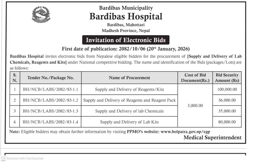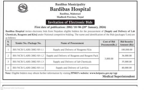 अस्पताल सामाग्रि खरिदका लागि विधूतिय वोलपत्र आव्हान सम्बन्धि सूचना।