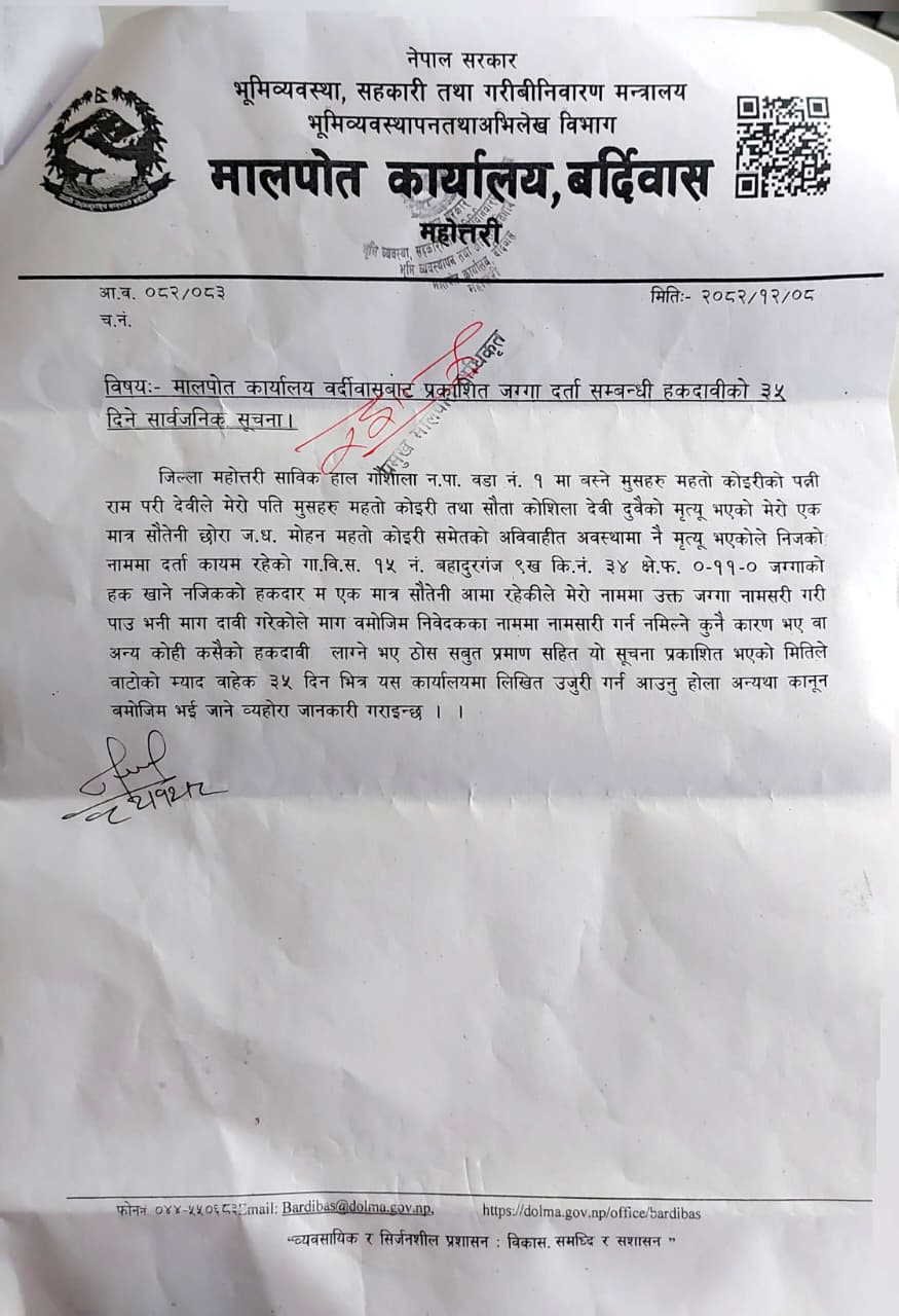 जग्गा दर्ता सम्बन्धि हकदावीको ३५ दिने सार्वजनिक सूचना।
