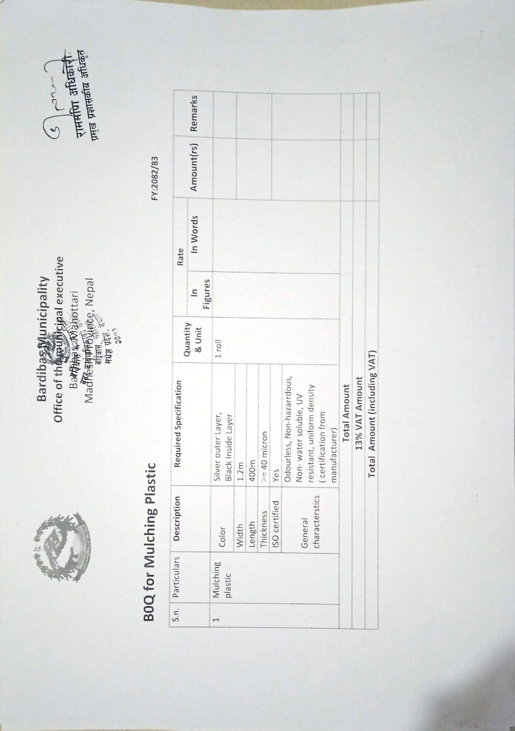 मल्चिङ प्लास्टिकको दररेट सहित कोटेशन पेश गर्ने सम्बन्धि सूचना।