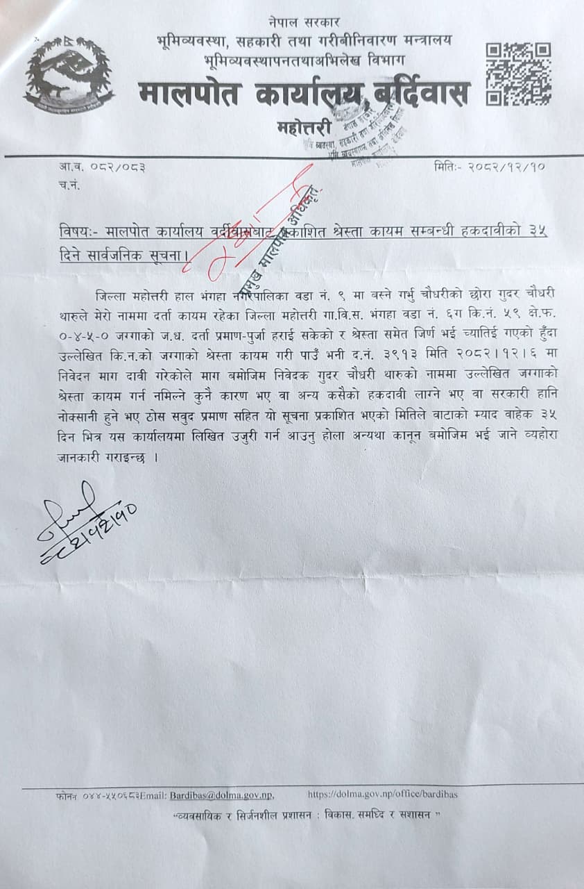 जग्गा दर्ता सम्बन्धि हकदावीको ३५ दिने सार्वजनिक सूचना।