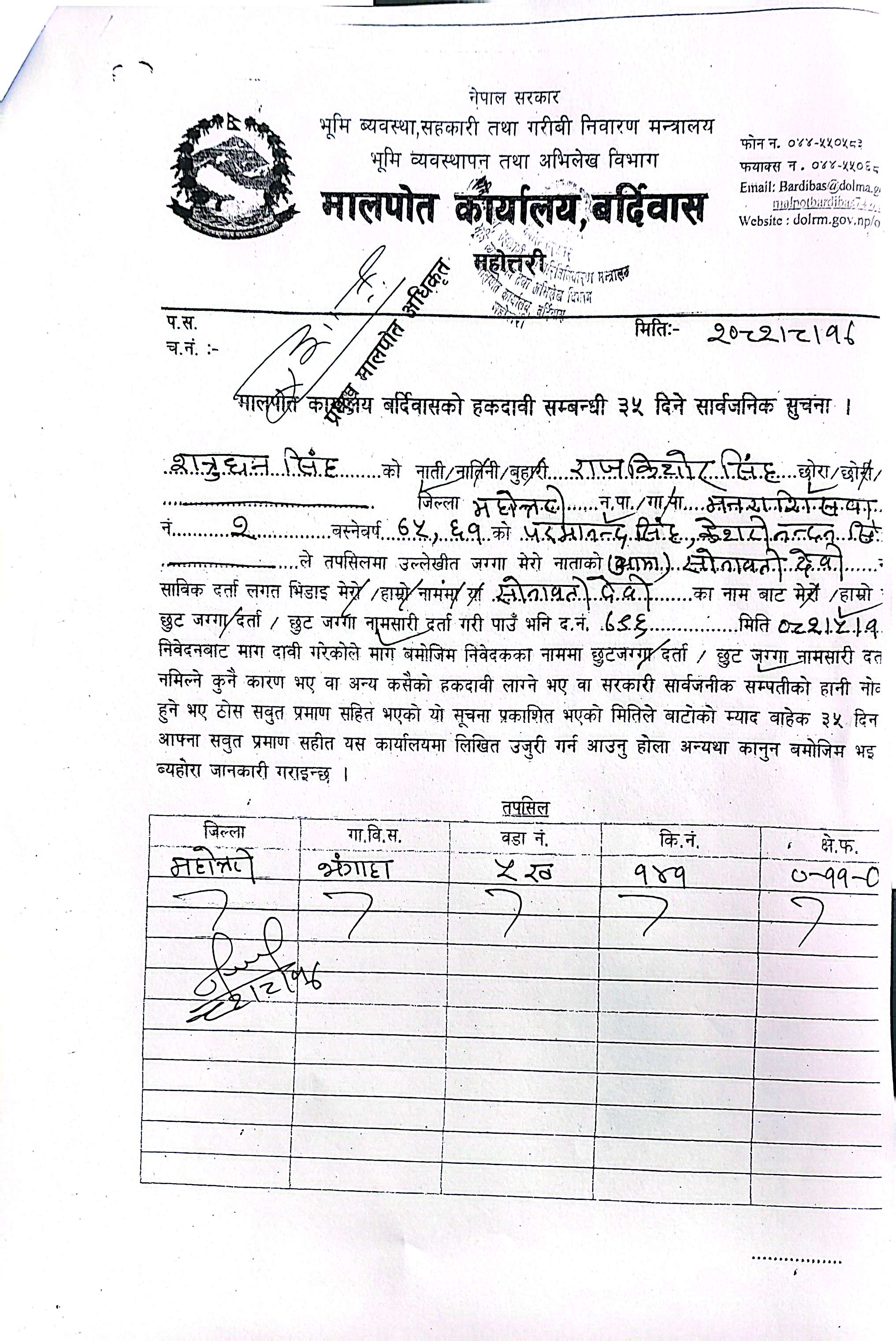 हकदावी सम्बन्धि ३५ दिने सार्वजनिक सूचना।